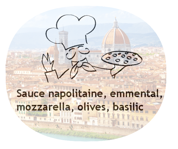 Sauce napolitaine, emmental, mozzarella, olives, basilic