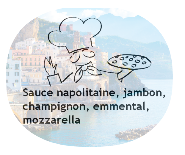 Sauce napolitaine, jambon, champignon, emmental, mozzarella