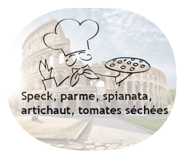 Speck, parme, spianata, artichaut, tomates séchées, gorgonzola, parmesan